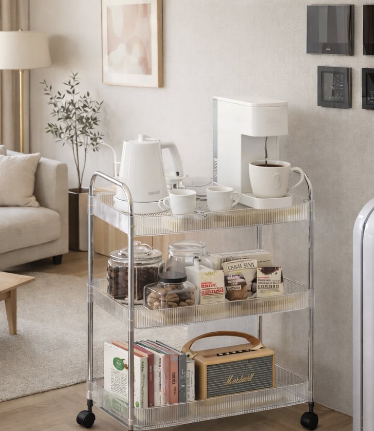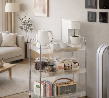 With a simple cart, neutral pieces, and thoughtful styling, you can easily recreate this aesthetic — even in the smallest space.